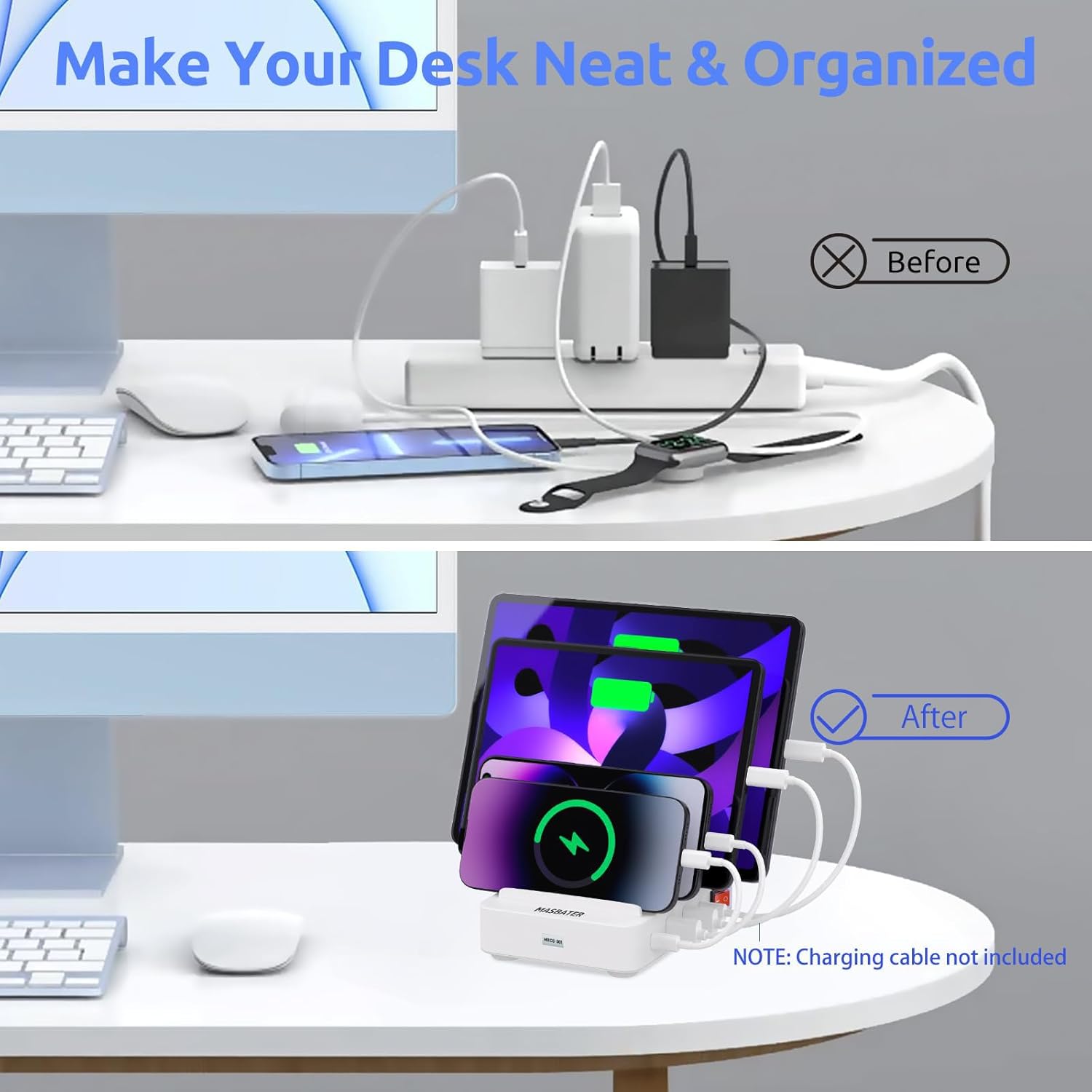 CREATIVE DESIGN 50W 6 Ports Multi Charger Station with 6 Charging Cables, USB Charging Dock for Multiple Devices, Compatible with Cellphone iPad Kindle Tablet and Other Electronic Devices
